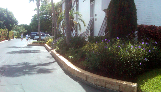 Raised decorative retaining wall defines the driveway.